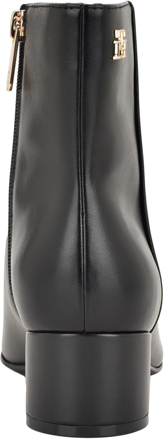 The classic and timeless Tommy Hilfiger Wendzy ankle boot is the item of the season. Wearable and simple block heels make this must have item stand the test of time. Elegant branded TH hardware adds sophistication and beauty to this minimalist style to go with any look day or night! Faux leather upper. Unlined. Cushioned insole. Zippered side closure. Stacked block heel. Pointy toe silhouette. Synthetic rubber outsole.