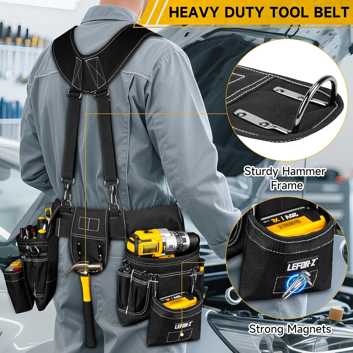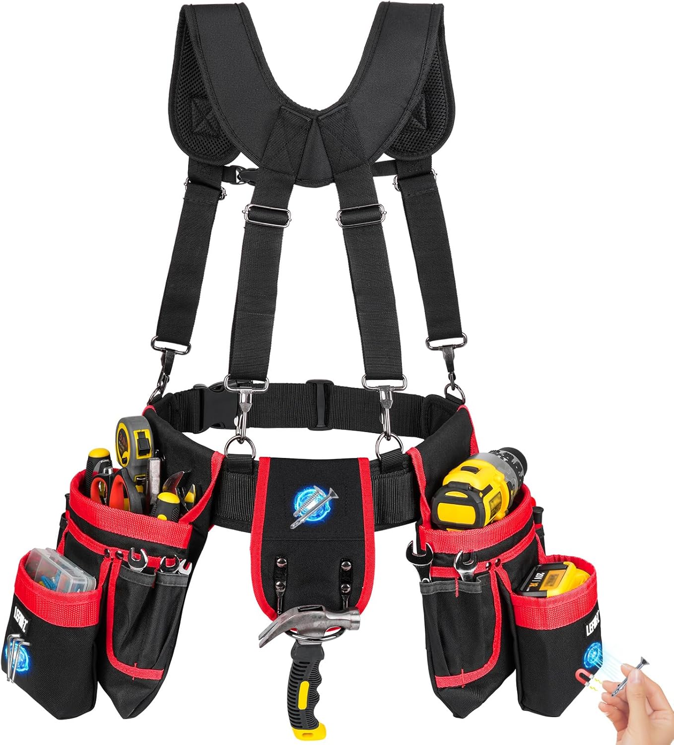 Tool Belt with Suspenders,27-Pockets Heavy Duty Tool Belts for Men with Magnetic Tool Pouch,Detachable & Adjustable Work Belt Bag for Electrician,Carpenter,Construction,Utility Toolbelt,Black