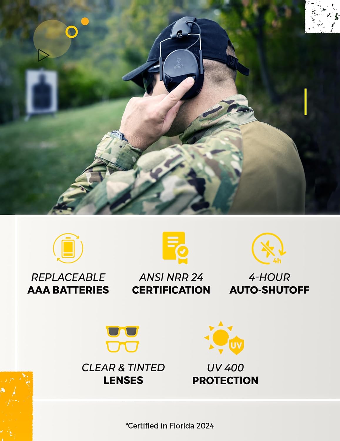 This comprehensive kit combines safety, comfort, and functionality, making it the ultimate choice for shooting enthusiasts. The NRR 24 electronic earmuffs offer robust hearing protection by reducing harmful gunshot noise while amplifying crucial sounds up to 5x, ensuring situational awareness. With a slim, lightweight design ideal for long gun use, the earmuffs feature a single-dial volume control, replaceable AAA batteries, and a 4-hour auto shut-off to conserve battery life. Certified to ANSI NRR 24 standards, they provide reliable, high-level noise reduction. Complementing the earmuffs, the included shooting glasses are available in both clear and tinted lenses, designed with anti-scratch and anti-fog coatings, UV400 protection, and a soft rubber nose piece for maximum comfort. Their flat arms fit seamlessly under the earmuffs, and they meet ANSI Z87.1 certification for impact resistance. To keep your gear organized, the durable carrying case provides secure storage for both the earmuffs and up to two pairs of glasses. Equipped with a carabiner for easy attachment and two mesh pockets for additional accessories, it ensures your gear stays protected and easily accessible. Available in black and pink, the case adds a touch of style while safeguarding your essentials. This kit also includes access to the Firearm Confidence Course, featuring 10 expert-led modules to improve your shooting skills and safety knowledge. With every purchase, TradeSmart donates 20% of profits to support the education of underprivileged children, making this kit an investment in both your safety and a meaningful cause.