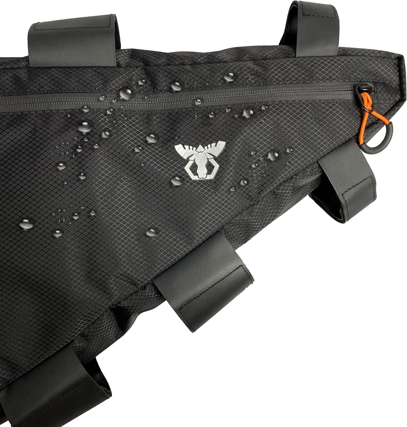 Trail/Mountain Bike Full Frame Bag - Designed to carry all of the gear you need to Bikepack and Tour across the globe or across town! Carrying the weight low on the bike within the frame triangle provides better stability and handling while riding up steep climbs or descending technical singletrack!Near custom fit! - Available in 3 sizes, Trail/Mountain Bike Full Frame Bag will fit most mountain, trail, and fat bikes. Measure the dimensions on the inside of your bike frame (Top tube length, seat tube length, down tube length) then choose the frame pack with slightly smaller dimensions. NOTE: SIZE LARGE TEND TO RUN BIG! MEASURE CAREFULLY AND IF IN DOUBT CHOOSE THE SMALLER SIZE! Also check out Touring/Road Bike Frame Bags!Trail/Mountain size Large - 8.5L Capacity, Weight: 275gTrail/Mountain size Medium - 7L Capacity, Weight: 245gTrail/Mountain size Small - 6L Capacity, Weight: 207gNew Premium Zippers and Liner Material - High-quality, durable, water-resistant zipper made by YKK. New stronger frame bag liner material and shorter velcro straps.Durable and Water Resistant! - Built to last! Made from durable ripstop nylon laminated with thermoplastic polyurethane, this frame bag is water resistant! While the fabric of this frame pack is waterproof the frame bag is not “waterproof”, during sustained heavy rains or submersion in water, there is a possibility for some moisture to enter the pack through the stitching. It is recommended to use an internal dry bag to protect any gear that is sensitive to water exposure.Versatile Design - 2 zipper compartments separated by a removable divider. Great for ebike batteries!