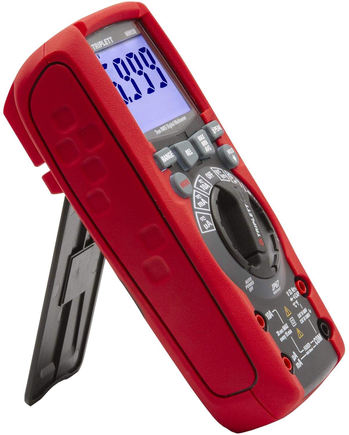 The Triplett MM650 is a 6000 count high performance digital multimeter with True RMS readings to provide better accuracy when measuring non-sinusoidal or noisy waveforms. It offers a large variety of measurement features including AC/DC Voltage, AC/DC Current, AC/DC µA Current, Resistance, Temperature, Frequency, Capacitance, Continuity, and Diode Test. Additional features include 61-segment analog bar graph, backlit LCD, buttons and switch selector, Lo Z (impedance) mode for identifying ghost voltages, data hold, peak hold, relative mode, and a built-in flashlight. The rubberized overmolded housing provides impact and drop resistance in a sleek ergonomic design that is also waterproof (IP67). CAT IV 600V safety rating provides superior resistance to damage from transient overvoltages in any demanding industrial settings. The MM650 is suited for a variety of industrial and residential applications such as security, home theater, electrical, HVAC installations and more. Includes test leads, temperature probe, (4) AAA batteries, and carrying case.