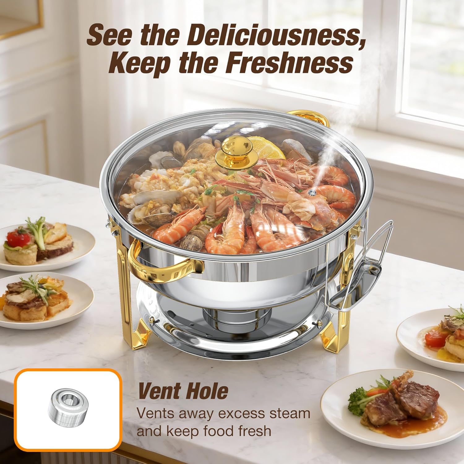 WARMOUNTS 6QT Gold Chafing Dishes for Buffet with Glass Lid