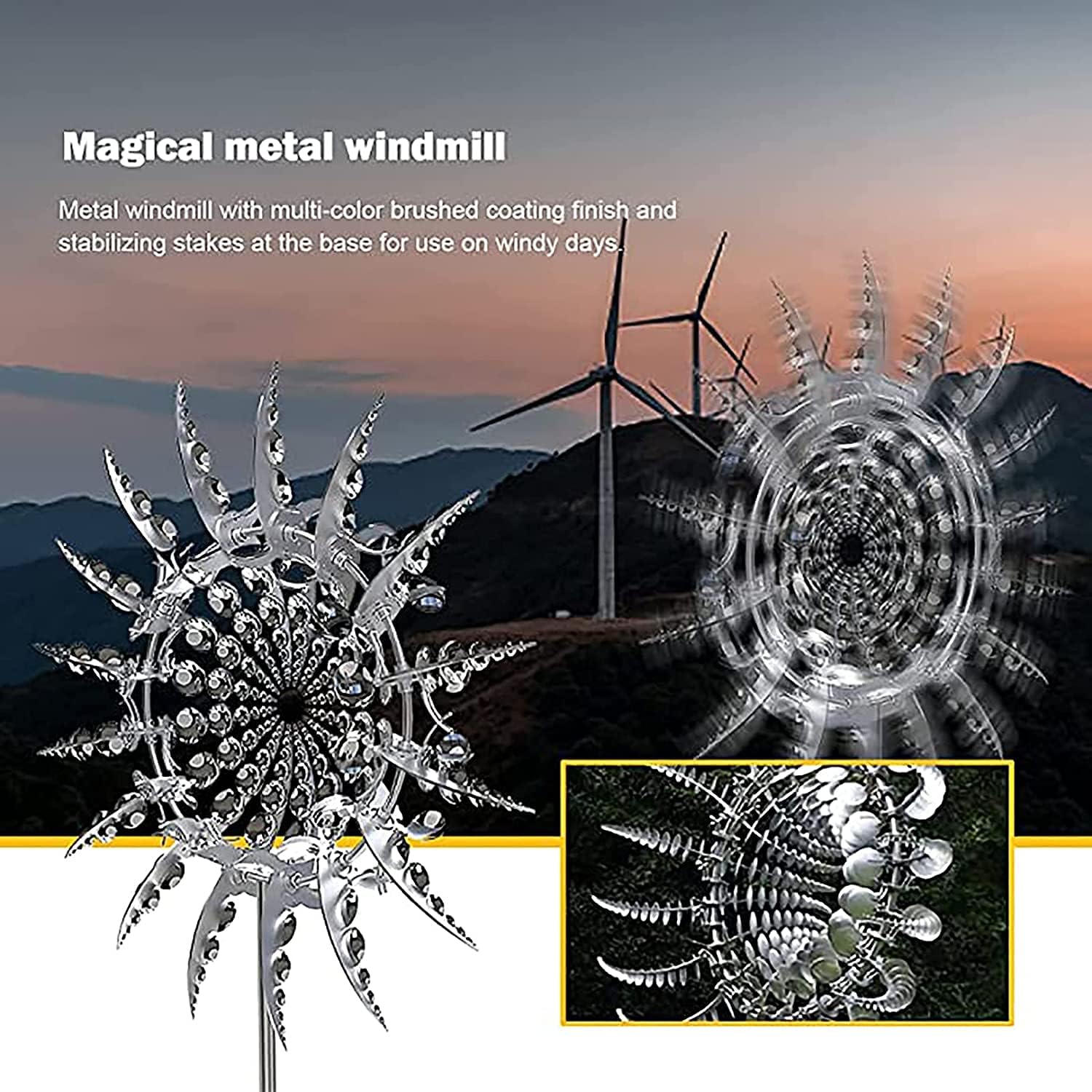 ♥♥♥ I increased the size of this windmill slightly to a diameter of 40cm, which is more suitable for decorating the courtyard. There are many windmills that are the same as ours, most of which are 30cm in diameter. Metal windmills can bloom and close with the wind. Each leaf is shining, very attractive and will make your courtyard full of vitality.Name: Metal WindmillProduct diameter: 40cmProduct pole length: 70cmProduct weight: 400g