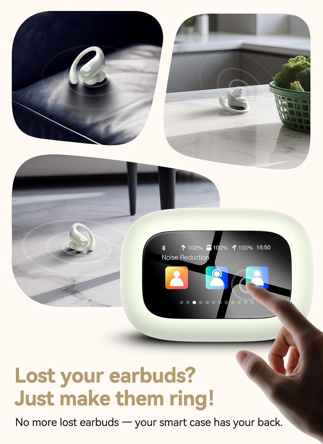 Next-Generation Touchscreen Control Case:Redefining the way sport earbuds operate, these Bluetooth earphones integrate intuitive single-tap earbud controls with a fully interactive touchscreen charging case. With a quick swipe or tap, you can adjust volume, skip tracks, choose from 5 EQ sound modes, track your earbuds, or answer calls instantly. Whether you're in a meeting, commuting, or pushing through an intense workout, the Smart Touch Interface gives you fast, effortless, and truly hands-free control of your entire listening experience.
