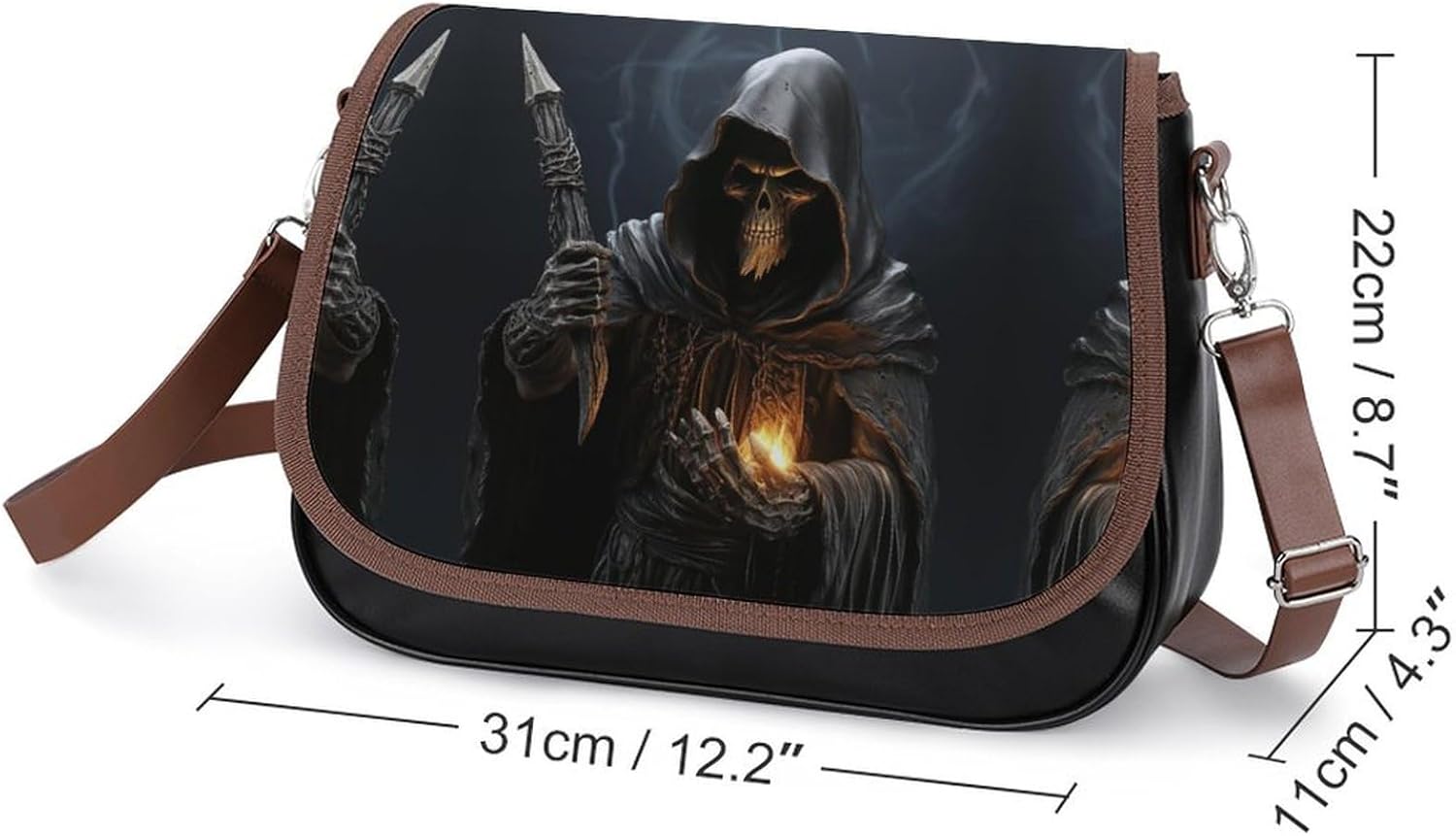 This women's shoulder bag Grim-Reaper printed combines fashion-forward UV printing technology with exceptional functionality. Made from high-quality waterproof PU leather, it features vivid, long-lasting patterns infused directly into the material for superior fade resistance. The detachable 25.6-inch strap allows versatile carrying options as a crossbody or shoulder bag, while the roomy interior (12.2x8.7x4.3 inches) organizes all daily essentials with multiple compartments. Perfect for work, travel, shopping, or special occasions, its durable construction resists wrinkles and scratches. With its unique artistic design and gift-ready presentation, this bag makes a memorable present for any modern woman seeking both style and practicality in her everyday accessory.