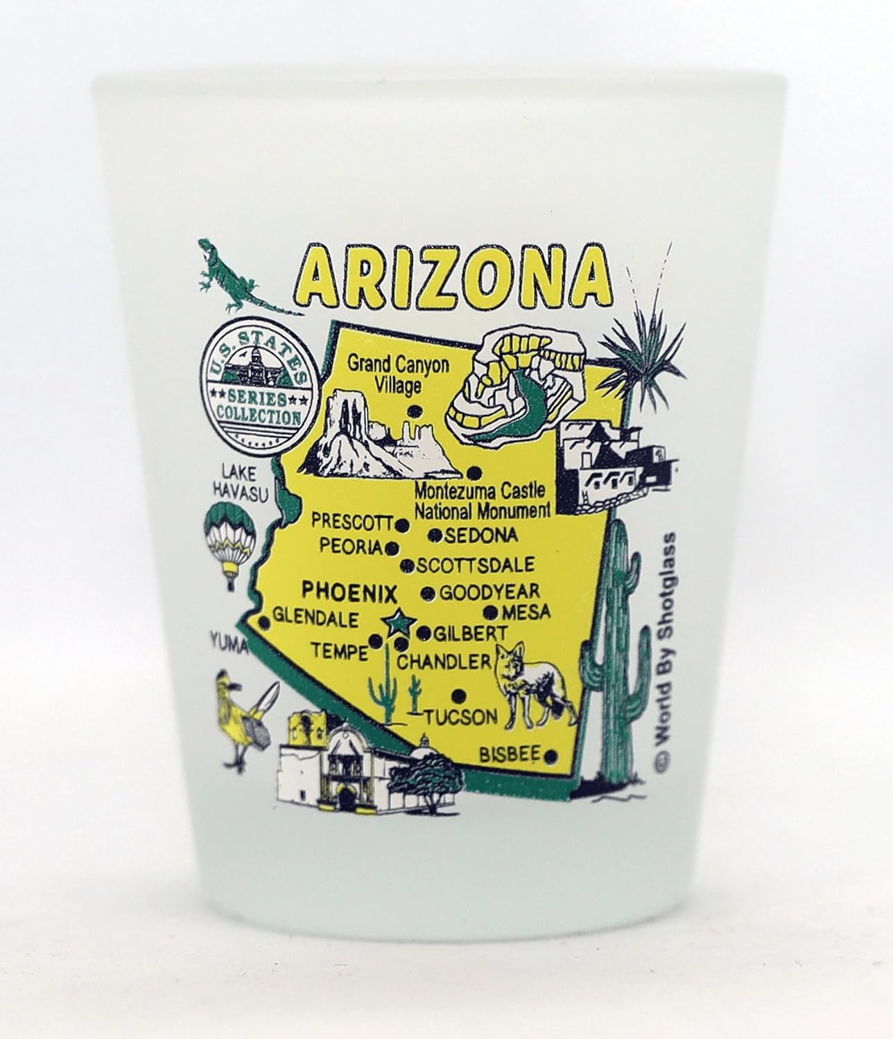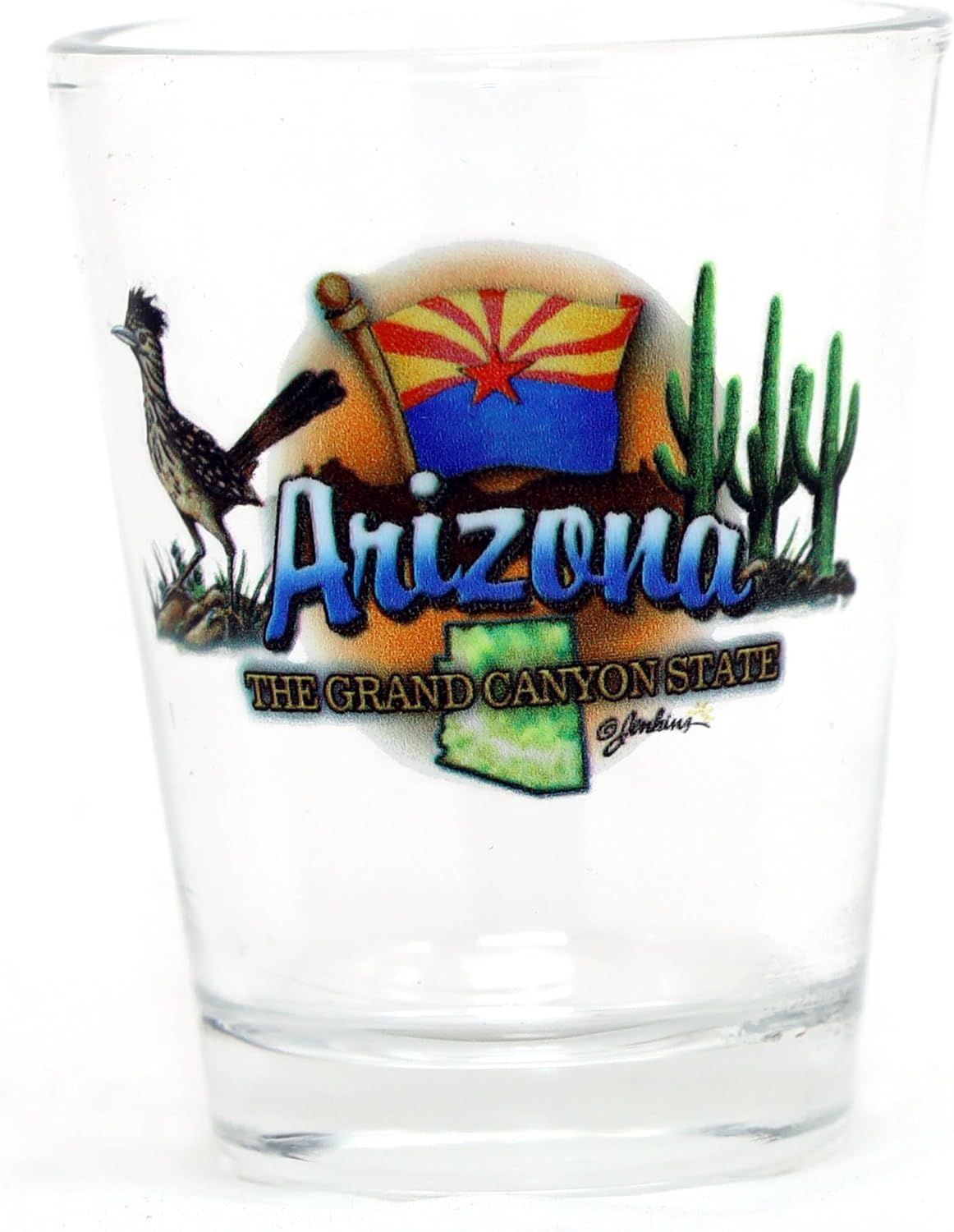 Here is a very rare and hard to find souvenir collectible Arizona United States USA Souvenir Boxed Shot Glass Set (Set of 6). It is a 5x6cm style shot glass boxed set, each glass measuring 2.25 inches tall and 1.8 inches in diameter.