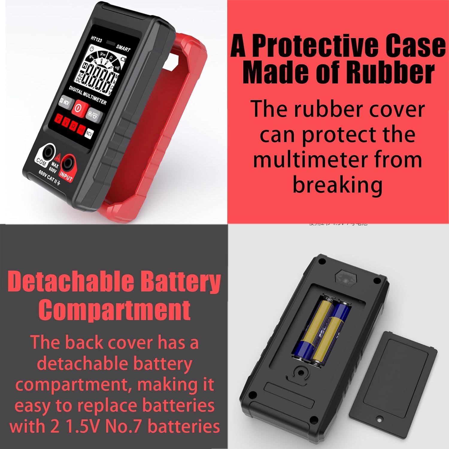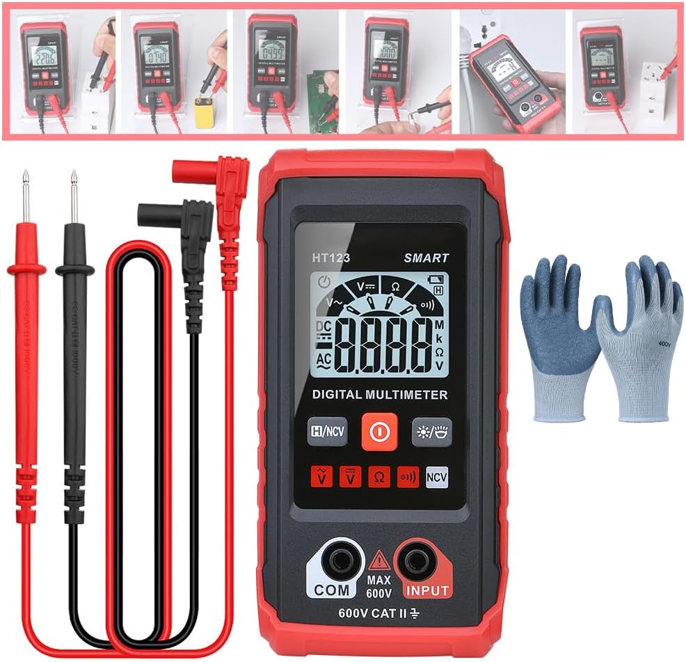 Specification: Product Name: Smart Digital Multimeter Dc Vol E: 0.8-600v ( : 610v) Ac Vol E: 0.8600v ( : 610v) Resistance: 600kω Counts: 2,000 Counts Ncv: Yes Display with Gear Display: Yes Data Hold: Yes Backlight: Yes Light: Yes Low Indication: Yes Auto Power-Off: Yes Material: Abs Power Ply: 2 * 1.5v Aaa (Not Included) Item Size: 4.6 * 2.3 * 1 in/ 11.8 * 5.8 * 2.6cm Package Size: 5.71 * 3.74 * 1.61in/ 14.5 * 9.5 * 4.1cm Package List: 1/2/3 Pcs * Multimeter 1/2/3 Pair * Test 1/2/3 Pcs * Manual 1/2/3 Pair * Gloves How to Use: Step 1. Please remove the rubber sleeve behind the multimeter, open the battery back cover, and put 2 AAA batteries into the battery compartment according to their polarity marks. Place the battery cover back on. Step 2. Turn on the multimeter, insert the test leads according to the prompts, and enter the test after the two ends of the test leads are in contact with each other for calibration. Step 3. To measure AC/DC voltage, resistance, or continuity. Insert the test leads into the multimeter and connect them to both ends of the measured object. The multimeter measures automatically without user selection. Note: 1. No need to use test leads if you want to use the NCV function. Due to the difference of light and screen, the color of the item may be slightly different from the picture. 2. Please allow a slight deviation in the measurement data and make sure you don't mind before ordering. 3. We Care. In the unlikely scenario that you are dissatisfied for any reason at all, please don't hesitate to contact us. We always go above and beyond to show customers how much we truly care! 4. Thank you very much for visiting our store. Have a nice shopping day.