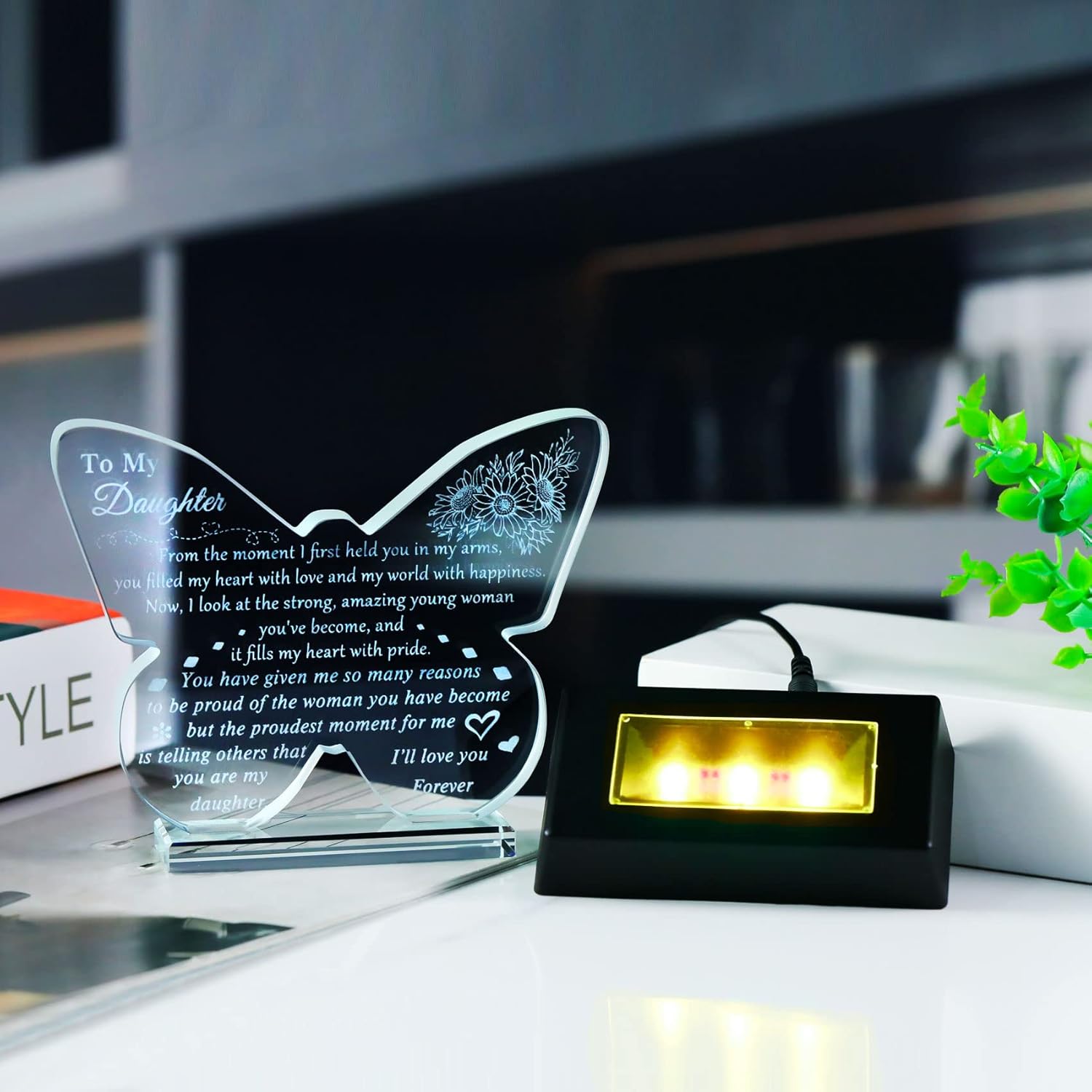 Give this butterfly-shaped glass craft to your daughter as a gift that she will feel happy and can retain for many years. The keepsake is made of glass material, and the patterns and words on it are engraved by laser, it will not be easily worn and will last for many years. Product Specification: Material: Glass Feature: Laser engraving Size: 6.3" x 5.1" x 1.2" Wight: about 1.9 lb. Package Include: 1 x Crystal keepsake 1 x LED light base 1 x Charging cable 1 x Specification of light base 1 x Gift box 1 x Gift card