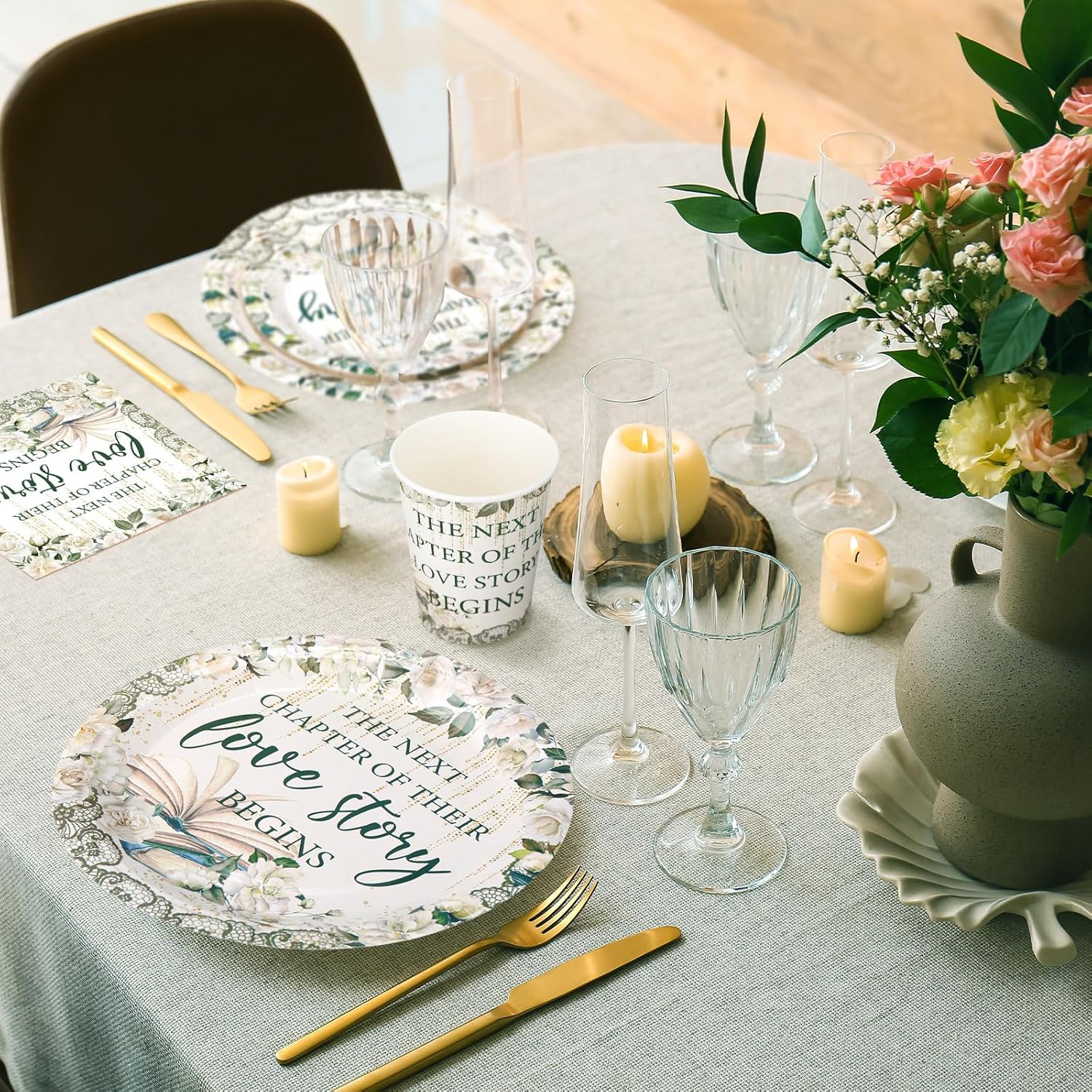 Zhehao 200 Pcs Bridal Shower Party Supplies Engagement Paper Plates Napkins Set for 50 Guests Spring Wedding Party Supplies Wedding Paper Plates with Flower (Next Chapter of Love)