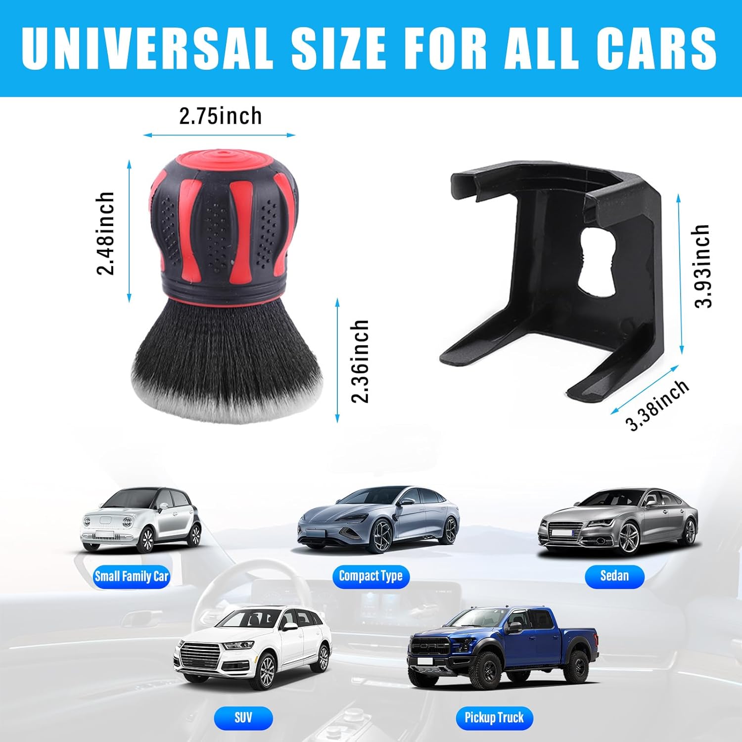 Specification:Color: Red/ Lake BlueSize: 4.84 x 2.76 inchesWeight: 0.62 IbMaterial: Nylon Wire & RubberVehicle Service Type: Universal FitWhy do you need this product?-With its super soft bristles, this car dusting brush is suitable for large areas that require a delicate touch.-This is a high quality car detailing and cleaning brush set that includes a super soft brush and a storage rack.-The handle has an anti-slip design with multiple concave surfaces and multiple rows of bumps, easy to grip and not easy to fall off.